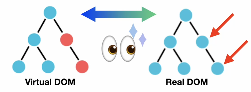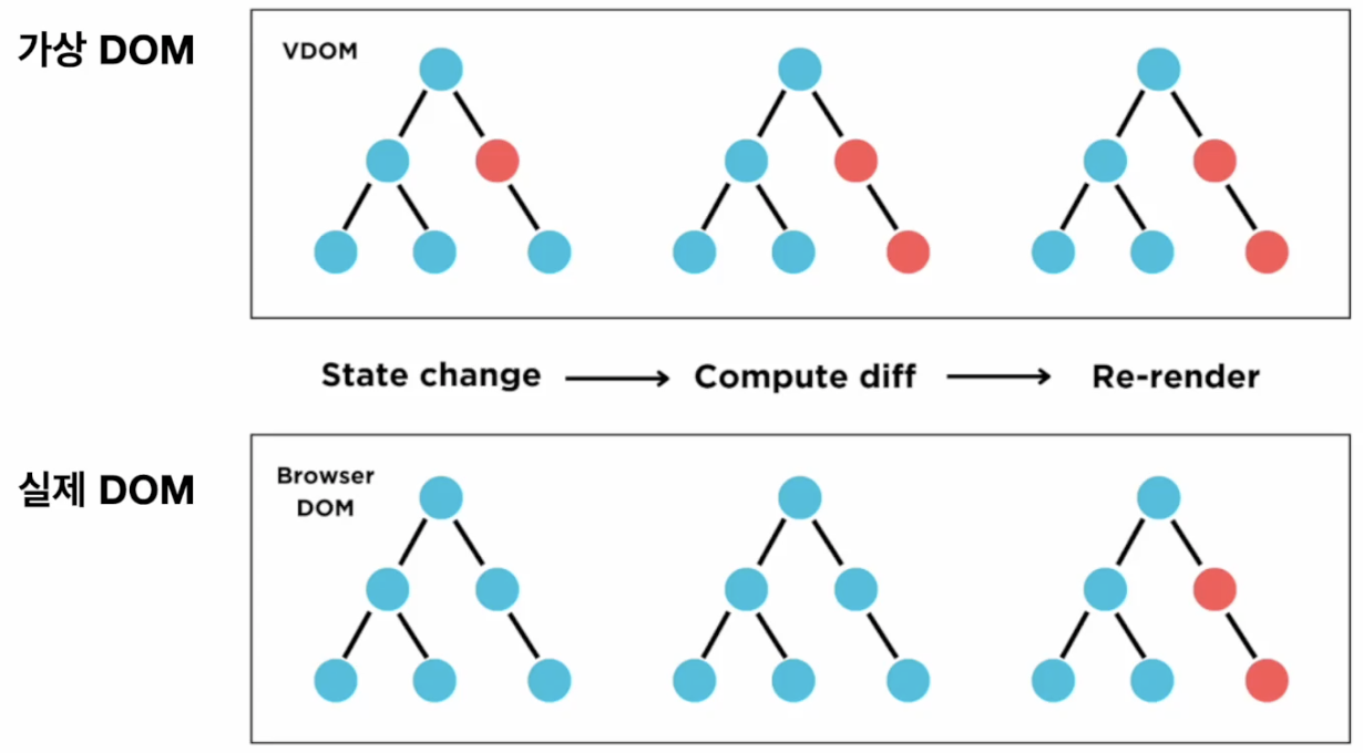 - 가상 DOM은 실제 DOM의 경량화 된 복사본으로, 실제 DOM에 직접적인 변화를 주기 전에 변경사항을 먼저 가상 DOM에 적용함으로써, 필요한 최소한의 변경만 실제 DOM에 반영하는 방식으로 동작한다